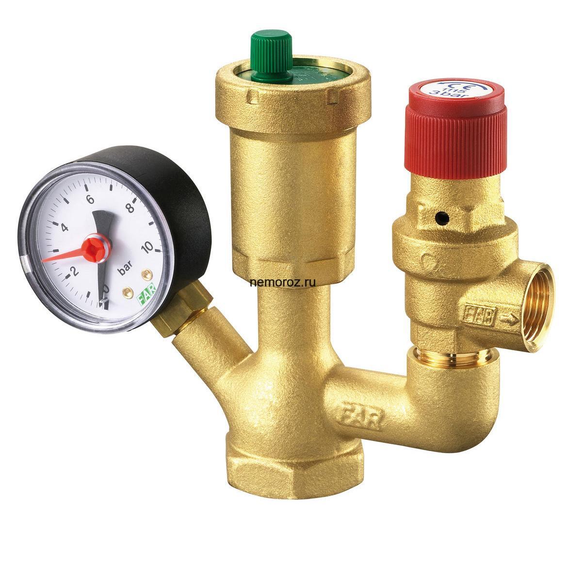 Из всего оборудования индивидуальной системы отопления, самым опасным является котел. Поэтому клапан сброса избыточного давления ставят или непосредственно на сам котел (если есть соответствующий выход под установку) или на подающей магистрали сразу после котла. Расстояние небольшое — 20-30 см от корпуса. Если в котле отсутствует этот вид арматуры (указано в описании), то его устанавливают в так называемой группе безопасности или ставят отдельно. Группа безопасности ставится на отвод от подающей магистрали сразу после котла (до первого ответвления и любого другого устройства), на котором установлены манометр, автоматический воздухоотводчик и клапан сброса избыточного давления.
