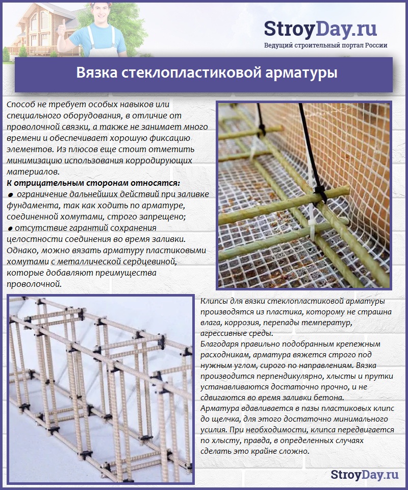 Такая технология применяется при необходимости соединить два стержня расположенных перпендикулярно друг другу. Особенно много таких участков в плитных фундаментах, где армирование производится сетками.
