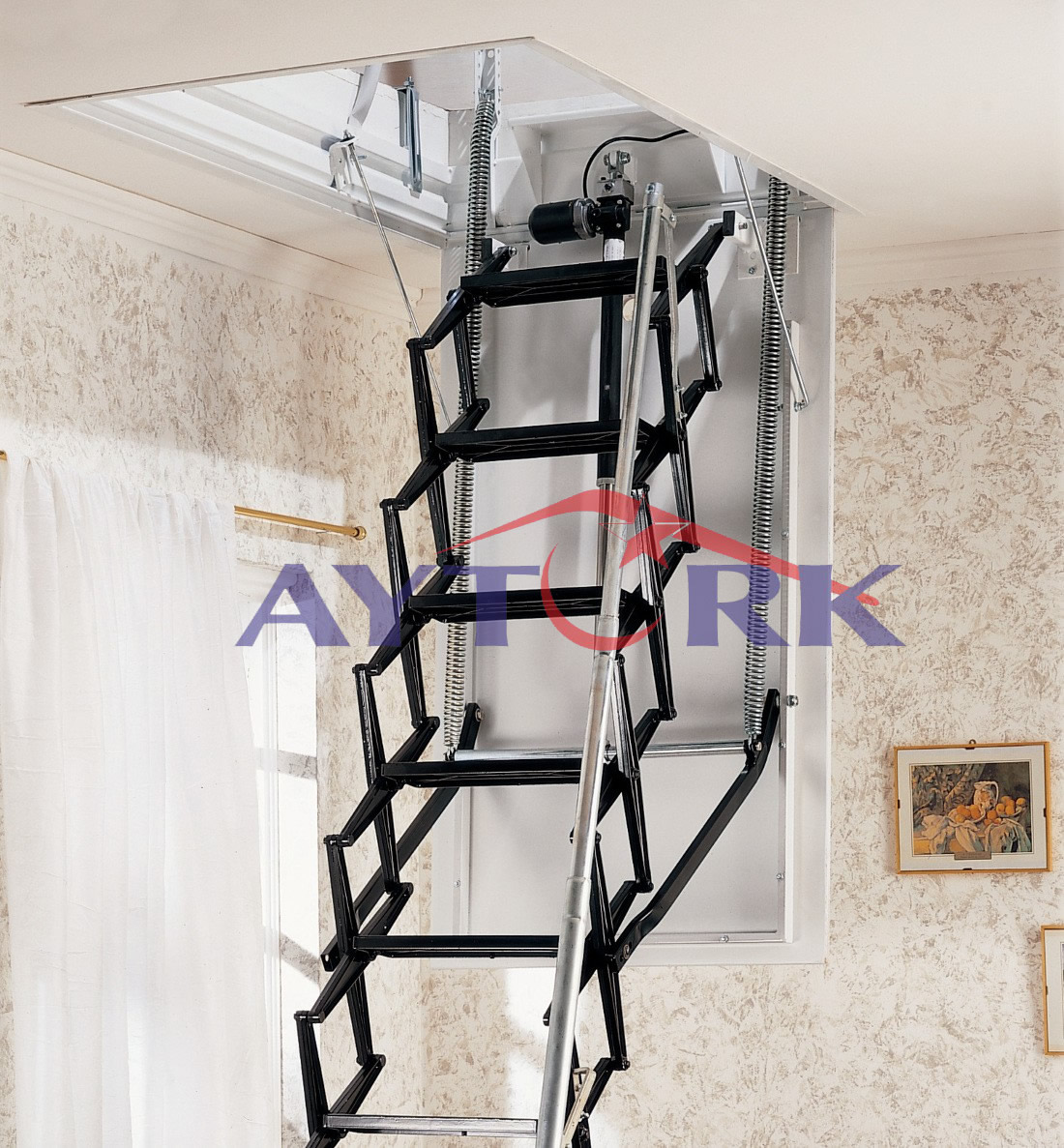 Складная металлическая чердачная лестница ножничного типа. Весьма сложная конструкция, и браться за ее самостоятельное изготовление – вряд ли оправдано