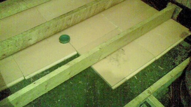- После установки сливной трубы производят заливку пола в бане бетонной стяжкой, при этом, пол выполняется с уклоном в сторону трубы. После того, как стяжка высохнет, на пол можно положить кафельную плитку или другой, устойчивый к влаге отделочный материал.